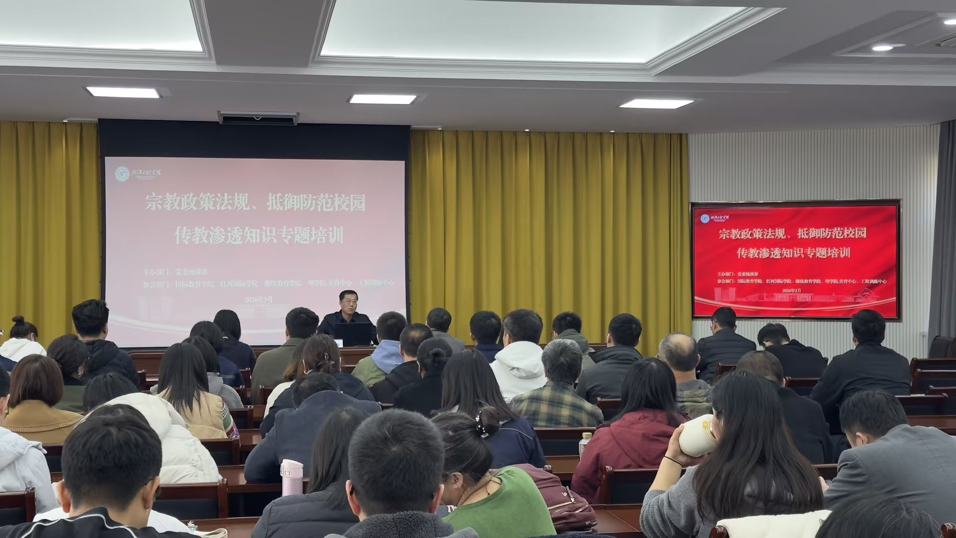 3月25日,太阳成集团tyc234cc组织全体教师参加了学校统一组织的宗教政策法规、抵御防范校园传教渗透相关知识学习培训。本次培训是落实学校《关于开展马克思主义宗教观宣传教育活动的实施方案》的文件精神,对全体教职工全覆盖开展相关知识培训的相关工作要求,通过本次学习培训,进一步提升了全体教职工的认知能力和水平。