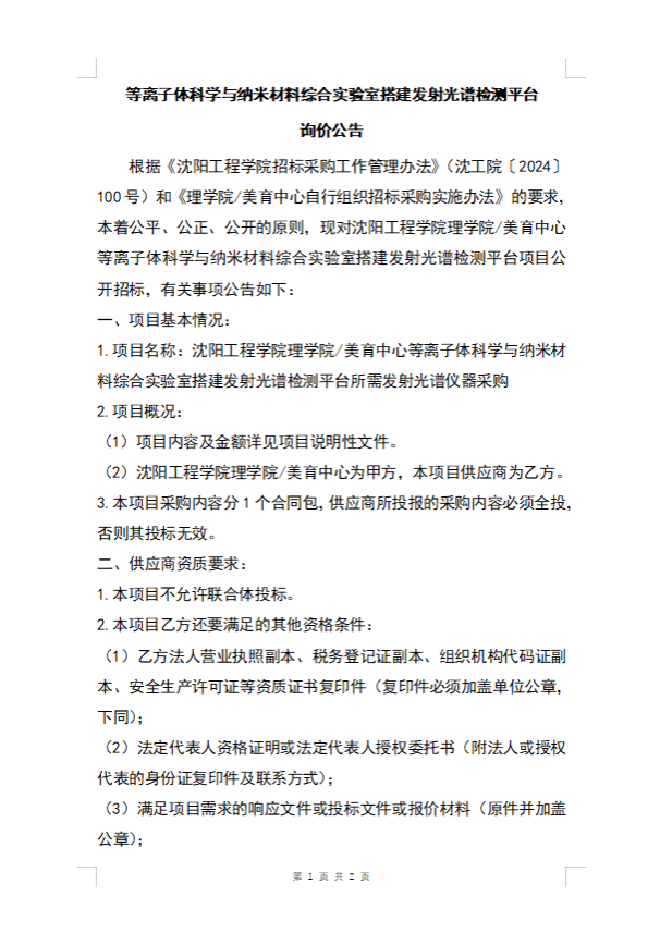等离子体科学与纳米材料综合实验室搭建发射光谱检测平台询价公告