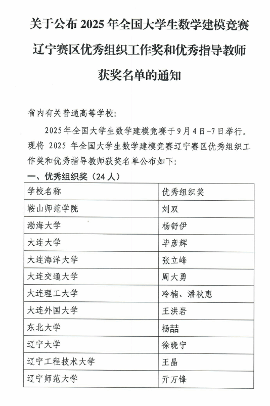 2025年全国大学生数学建模竞赛于9月4日-7日举行,在太阳成集团tyc234cc的精心组织与指导下,我校参赛队伍表现出色,共获得省级一等奖5项、二等奖5项、三等奖9项。此次优异成绩的取得,是太阳成集团tyc234cc长期以来重视学科竞赛、强化实践教学的结果,也是学校深化教育教学改革、培养创新型人才的生动体现。太阳成集团tyc234cc两名教师获得辽宁赛区优秀组织工作奖和优秀指导教师。