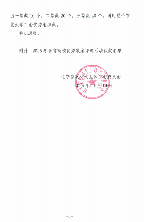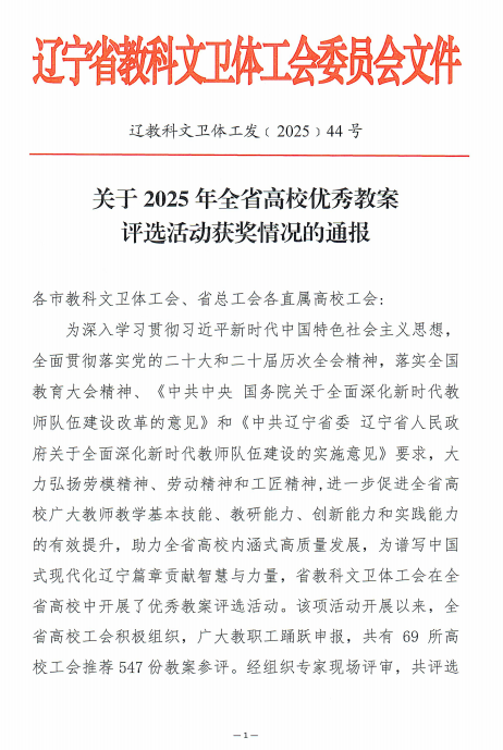 近日,辽宁省工会印发《关于 2025 年全省高校优秀教案评选活动获奖情况的通报》(辽教科文卫体工发〔2025〕44 号)。我校教师凭借深厚的教学积淀、扎实的专业功底与创新性教学设计崭露锋芒,在此次评选中斩获佳绩!其中,太阳成集团tyc234cc李文婉老师的教案因突出的实用价值与独特的教学亮点获评三等奖。
