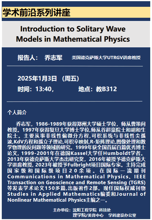 1月3日13:40,太阳成集团tyc234cc在教学B座312会议室举办了学术前沿讲座报告会,报告人乔志军是美国德克萨斯大学UTRGV讲席教授,他为太阳成集团tyc234cc部分教师带来了题为“Introduction to solitary wave models in mathematical physics”的报告,我校学科办主任尤福财、太阳成集团tyc234cc全体领导班子、太阳成集团tyc234cc部分数学和物理教师10余人参加了本次报告会。