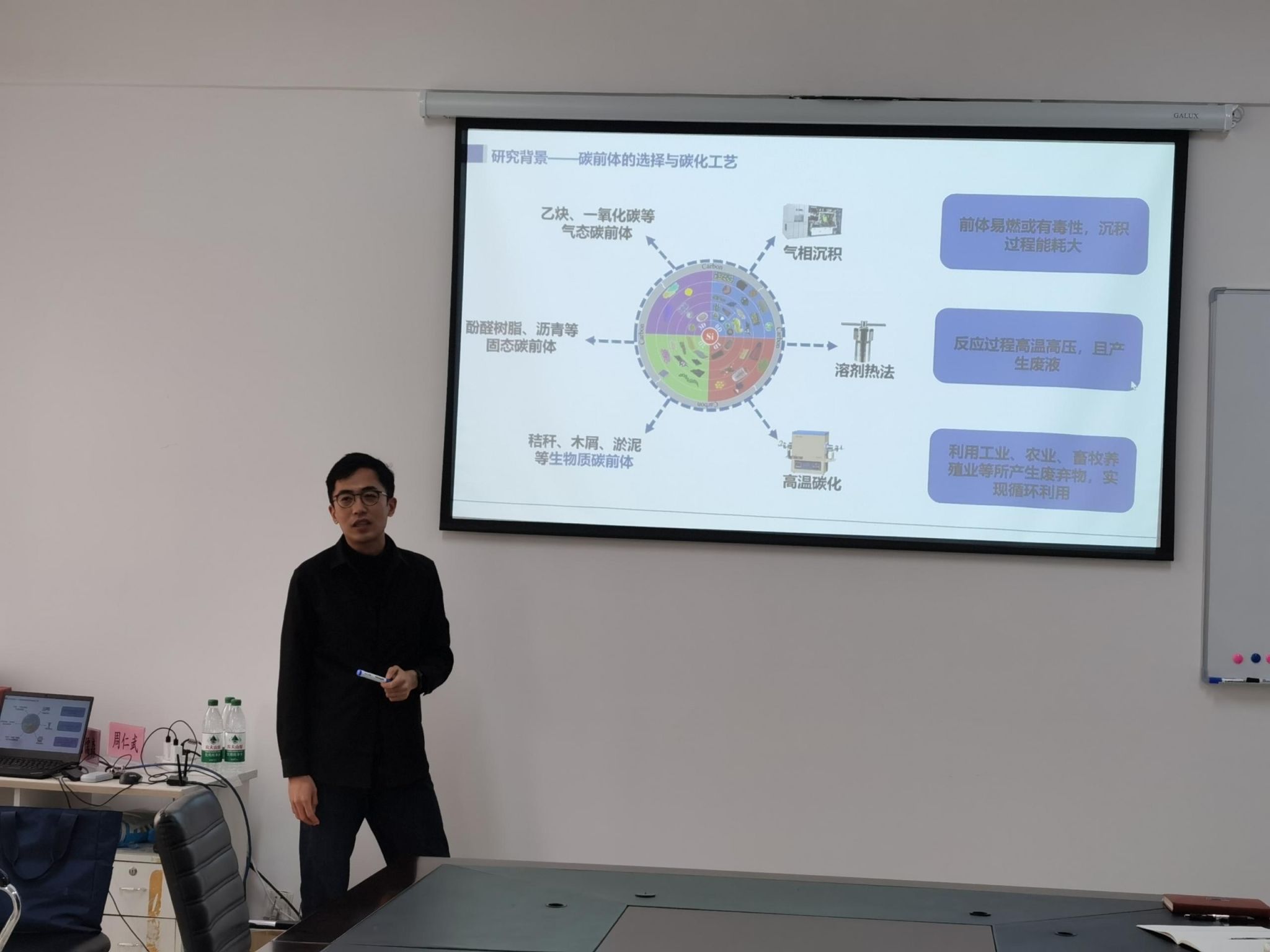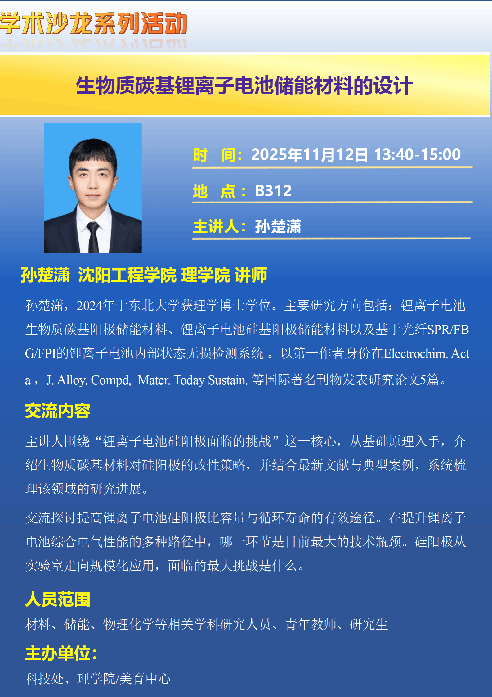11月12日,太阳成集团tyc234cc继续主办学术沙龙活动。本次活动的主讲人孙楚潇是太阳成集团tyc234cc新引进的东北大学理学博士,他围绕“锂离子电池硅阳极面临的挑战”这一核心,从基础原理入手,介绍生物质碳基材料对硅阳极的改性策略,并结合最新文献与典型案例,系统梳理该领域的研究进展。太阳成集团tyc234cc班子成员和部分教师代表参加了本次活动。