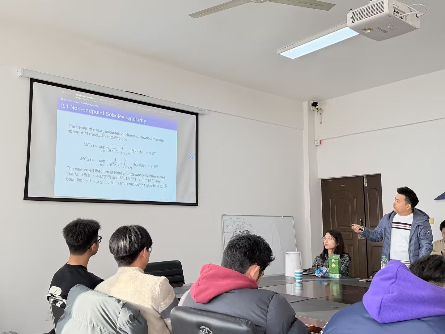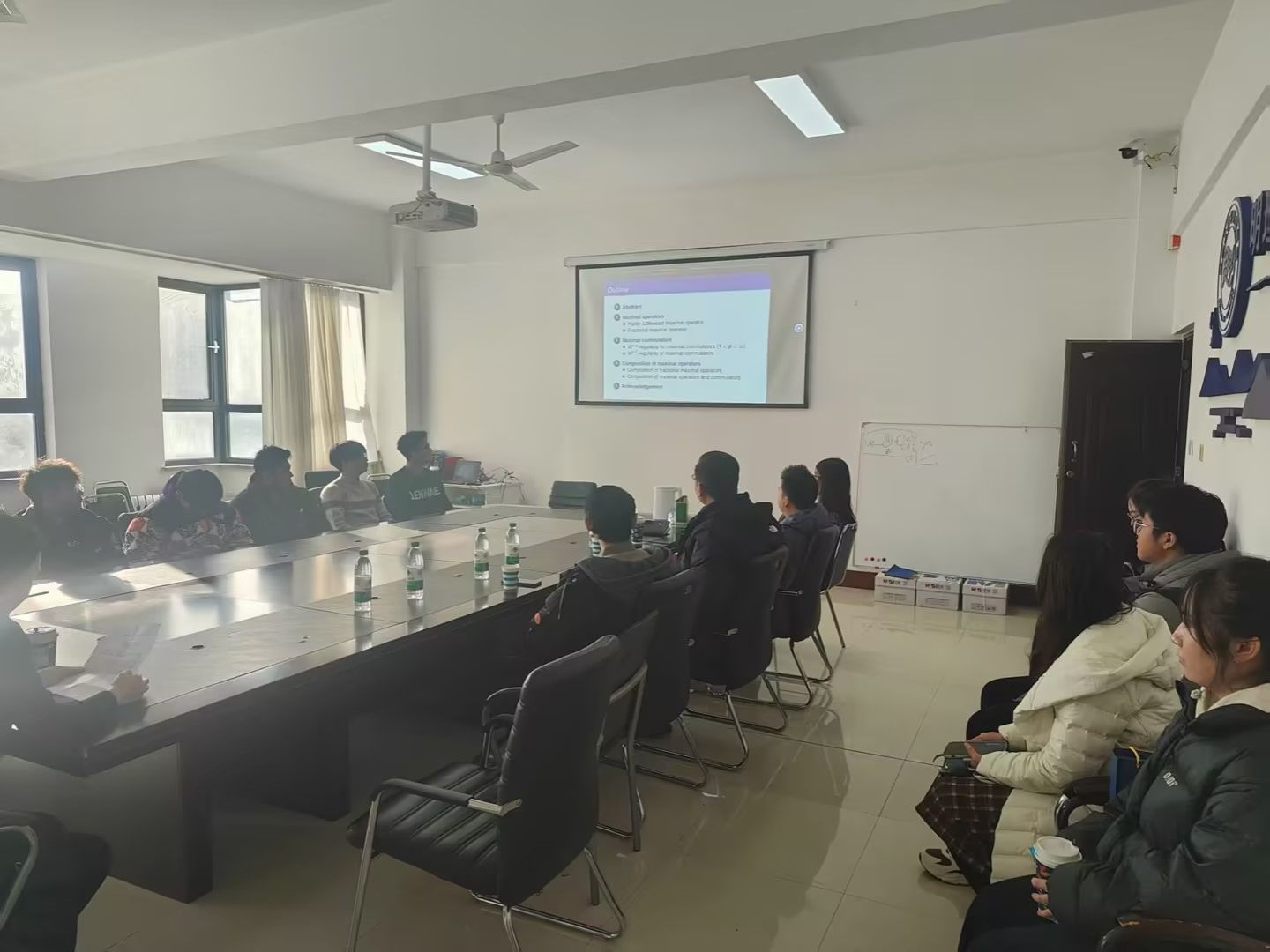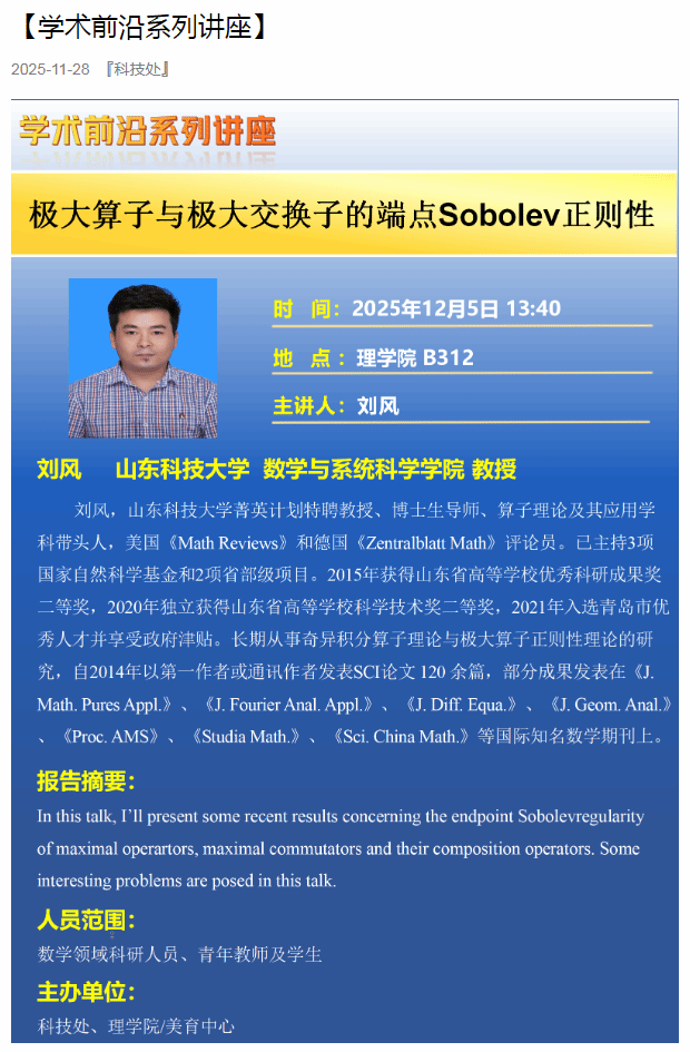 2025年12月5日13:40,太阳成集团tyc234cc在312会议室组织召开了学术前沿系列讲座,本次会议邀请到了山东科技大学菁英计划特聘教授、博士生导师、算子理论及其应用学科带头人、美国(Math Reviews》和德国《Zentralblatt Math》评论员、数学与系统科学学院刘风教授,他为我校数学领域的科研人员和师生带来了题为《极大算子与极大交换子的端点Sobolev正则性》的学术报告,会议由太阳成集团tyc234cc数学与应用数学研究室主任刘晓静博士主持,太阳成集团tyc234cc部分师生代表参加了本次会议。