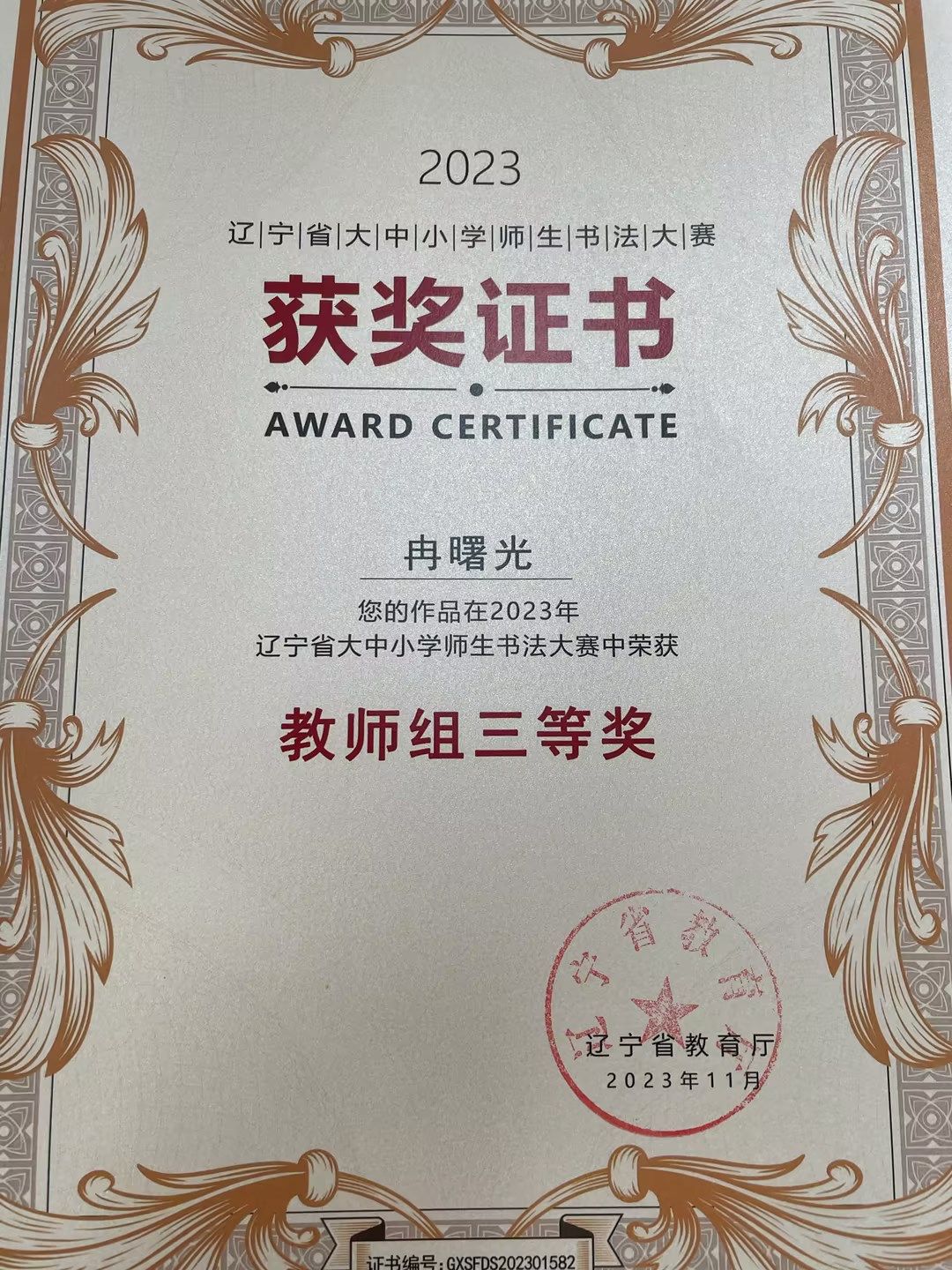 我校教师冉曙光、孙宏岩,分别在2023年辽宁省教育厅举办的“大中小学师生书法大赛”中获得教师组三等奖。