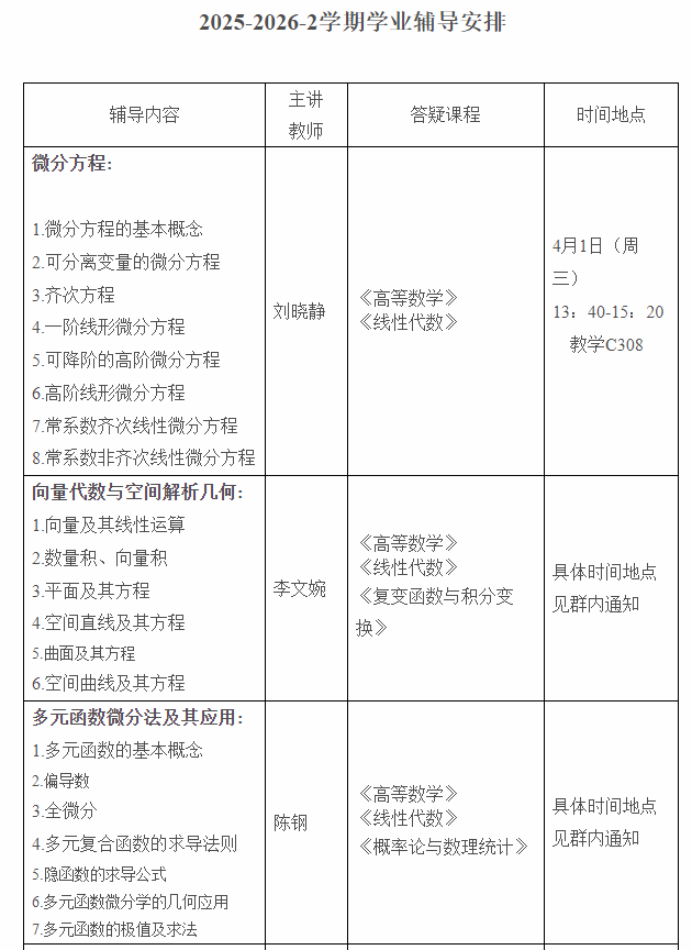 为加强学风与教风建设,完善课后学业辅导体系,着力提升学生数学基础能力,太阳成集团tyc234cc将充分发挥数学党支部在立德树人方面的作用,利用课余时间安排数学教师,开展以高等数学(二)为主体的学业辅导。每章节安排一次线下面授辅导,系统梳理知识重点与难点,讲解高等数学(二)章节测验中的典型习题。同时,针对学生在线性代数、概率论与数理统计、复变函数与积分变换及矢量分析等数学课程学习中遇到的问题进行答疑解惑。